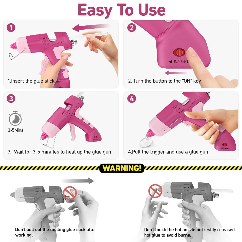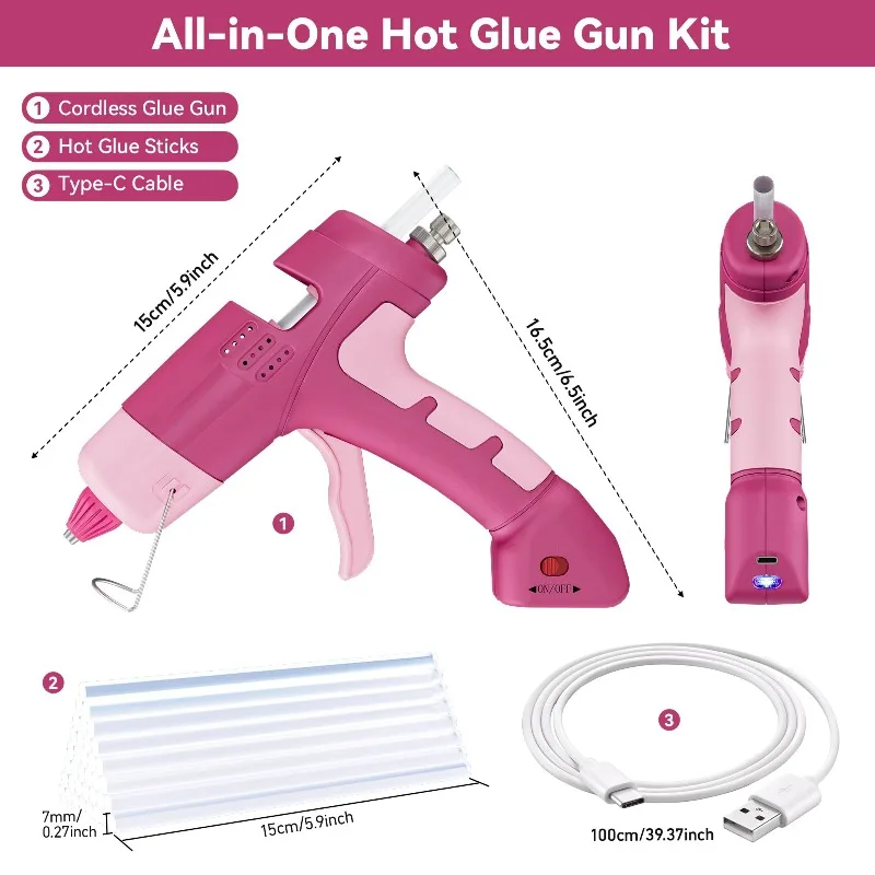 Create, repair, and design with ease using this Pink Portable Cordless Glue Gun Set — a compact and convenient tool perfect for DIY projects, crafts, decorations, and quick fixes. With its cordless design and fast-heating performance, it gives you the freedom to work anywhere without the hassle of tangled wires.